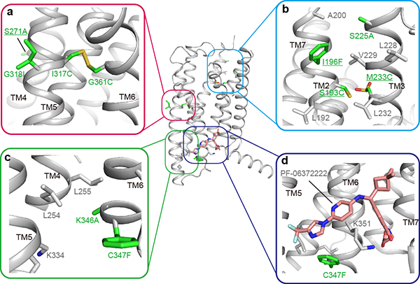 为了回答上述问题,课题组总结了曾经设计并测试过的所有98个突变,比较了这些突变的设计逻辑和实际作用,并且将存疑的几个突变进行了回复突变并解析了相应的蛋白结构。将实验数据与分子动力学模拟相结合,发现实际形成二硫键的两个突变(I317C-G361C) 对于结晶必不可少,而另两个并未形成二硫键的半胱氨酸突变(S193C, M233C)是可有可无的。通过分析必需的突变我们发现可行的突变策略如:1)将受体锁定在特定构象;2)增加分子内或分子间(用于晶体堆积)的相互作用力;3)增强跨膜螺旋的刚性;4)加强配体-受体结合界面。从突变手段上,我们发现,通过突变以增强疏水相互作用虽然特异性较低,但由于其更灵活反而易于实现;相反,更强的相互作用力,如氢键或者二硫键,由于他们对化学键的严格几何限制,成功配对的几率也相对低。本项研究可以为GPCR和其他膜蛋白结晶提供了一般突变设计策略。同时,本文的突变思路还可以将蛋白锁定为特定的构象,为进行功能或药理研究提供新的手段。