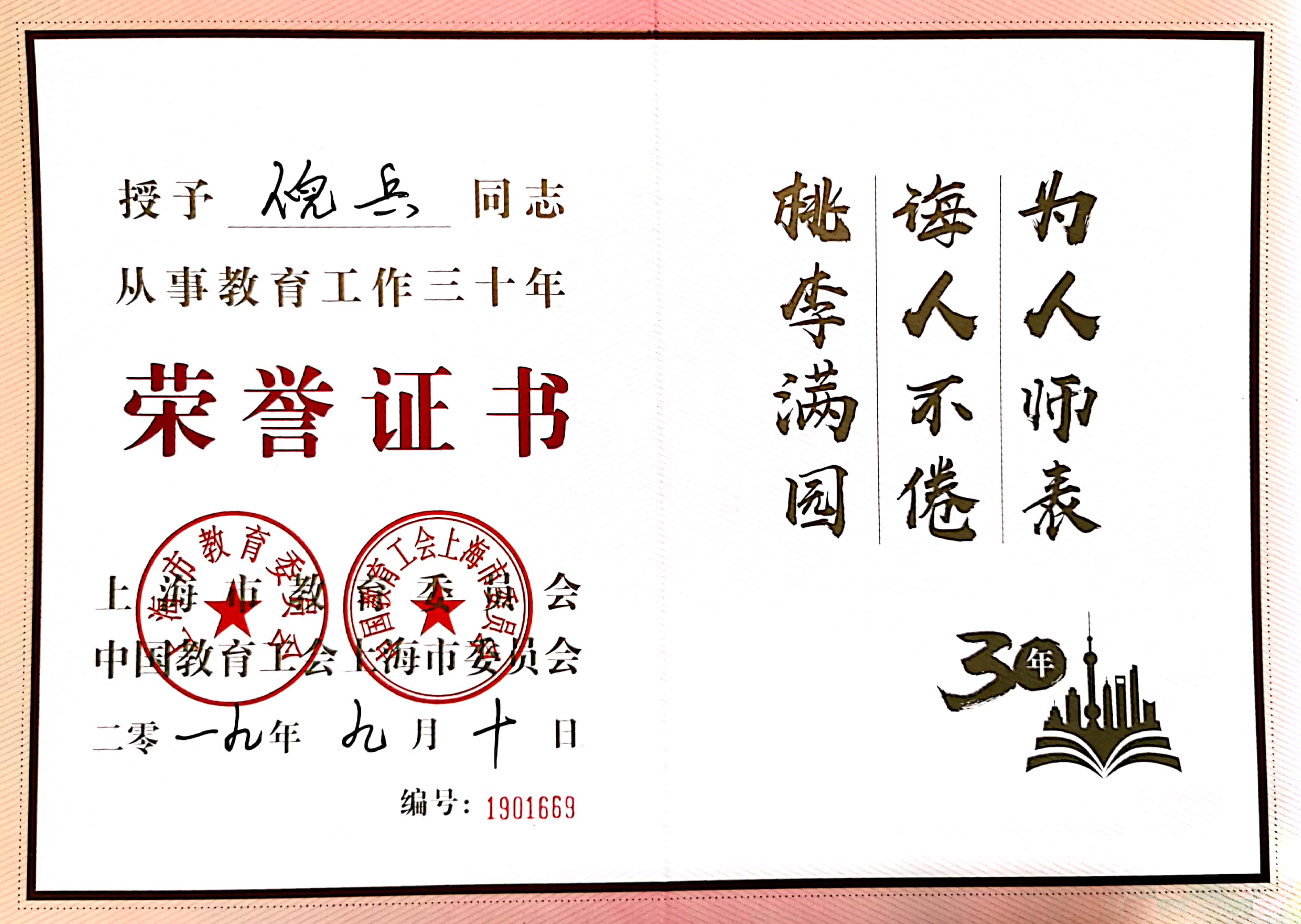 近日,上海市教育委员会、中国教育工会上海市委员会为性爱视频 高级工程师倪兵老师颁发了从事教育工作三十年荣誉证书。该证书旨在表彰爱岗敬业、尚礼育人、乐于奉献、具有立德树人的使命感与责任感的长期坚守在教育岗位上的老教师们。